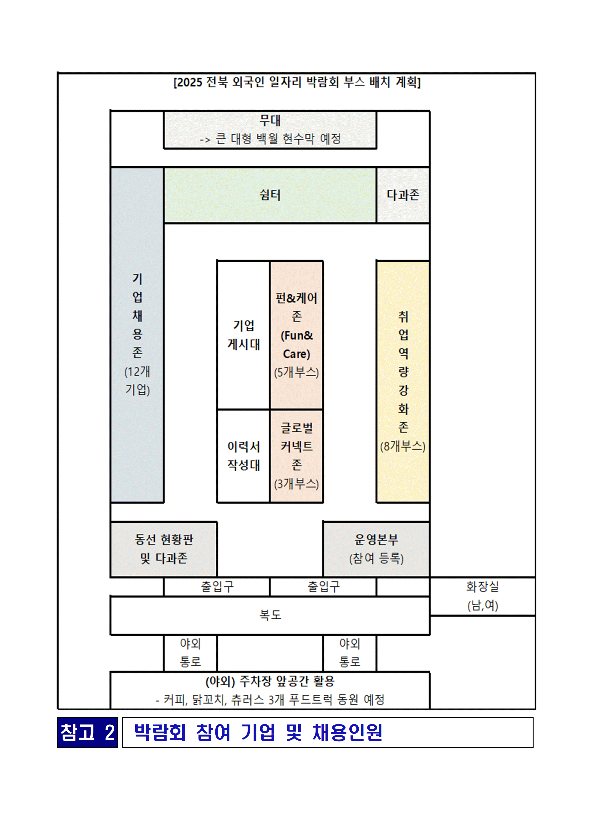 기업 채용존에는 도내 12개 우수기업(호텔서비스업 등 6개 업종)이 참여해, 외국인 35명 이상 채용을 목표로 현장 면접과 취업 상담을 진행했다. 취업 역량 강화존에서는 증명사진 촬영, 메이크업 및 퍼스널컬러 컨설팅, 이력서 클리닉, 노무 상담 등 실질적인 역량 향상 프로그램이 운영되어 참가자들의 호응을 얻었다. 또한 글로벌 커넥트존에서는 지역특화형 비자사업과 유학생 지원제도를 안내했으며, 펀&케어존에서는 지문적성검사, 캐리커처, 통역지원 등 다양한 부대 프로그램이 마련되어 박람회의 분위기를 한층 풍성하게 했다.