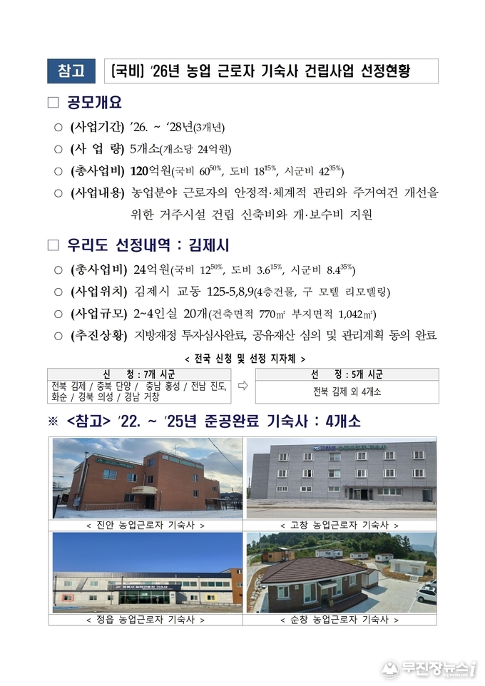 전북특별자치도는 농림축산식품부가 주관한 ‘2026년 농업근로자 기숙사 건립사업’ 공모에서 김제시가 최종 선정되었다고 23일 밝혔다.