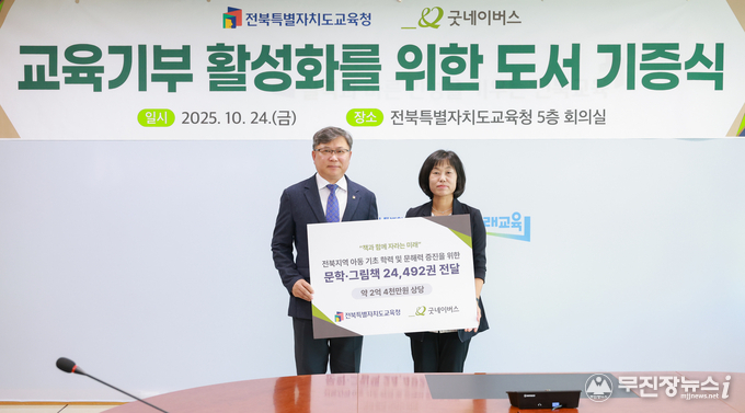 전북특별자치도교육청은 24일 본청 5층 회의실에서 글로벌 아동권리 전문 NGO 굿네이버스로부터 문학․그림책을 기증받는 도서 기증식을 개최했다.