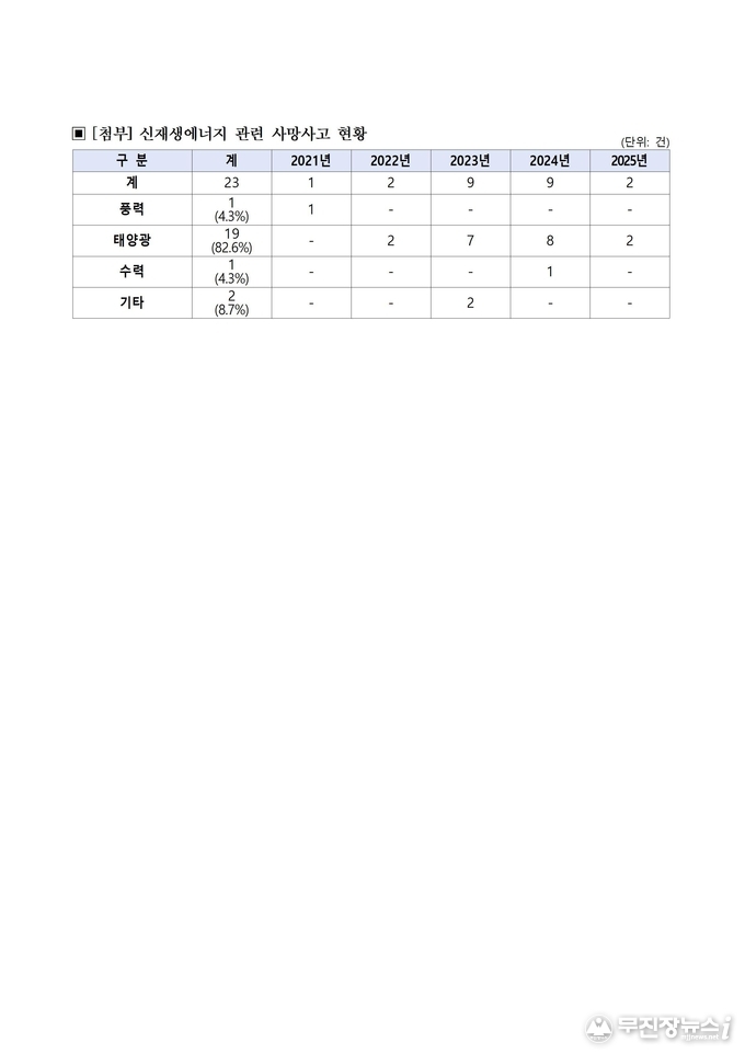 안호영 의원은 “최근 발생한 신재생에너지 관련 사망사고는 모두 전력이나 설비 등 기술적 문제로 인한 새로운 유형의 사고가 아니라, 추락사 등 기존의 ‘재래식’ 사고였다”며 “이재명 정부가 재생에너지 중심사회로의 전환을 약속한 만큼, 고용노동부는 그 과정에서 불필요한 인명피해가 발생하지 않도록 안전보건체계를 강화해야 할 것”이라고 강조했다.