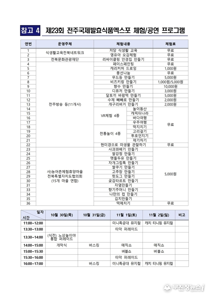 지역 농식품을 활용한 식문화 체험 프로그램과 어린이 뮤지컬, 타악 퍼레이드, VR체험 등 가족 단위 관람객이 함께 즐길 수 있는 다채로운 콘텐츠가 준비돼 가족 단위 관람객의 발길을 사로잡을 예정이다.