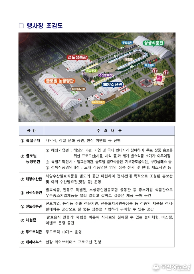 전시 판매장은 글로벌농생명관, 선도상품관, 해양수산관, 상생식품관으로 구성되며, 국내기업전에서는 전통 발효식품을 비롯해 전북특별자치도 우수상품, 6차산업상품 등 지역의 특화 상품들이 전시‧판매된다.
