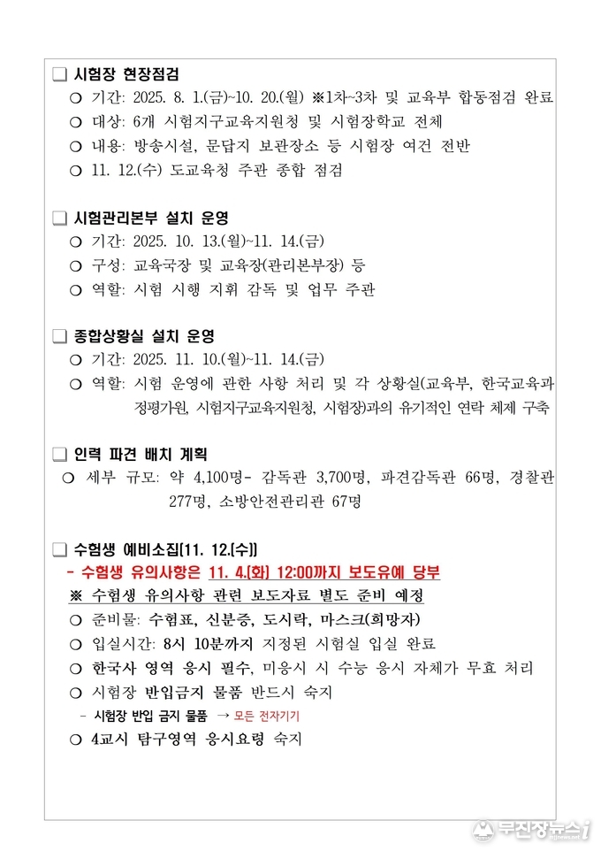 전북교육청은 올 상반기 수능 시험장을 확정하고, 지난 8월부터 방송시설을 포함한 전 시험장 현장점검을 완료했다. 전기·가스 안전 점검을 비롯해 수능 전 마지막 종합 점검을 통해 미비점이 발견되면 즉시 보완 조치할 계획이다.