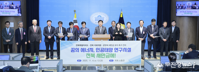 전북특별자치도가 4일 군산시, 전북 지역 국회의원들과 함께 국회 소통관에서 기자회견을 갖고 '인공태양'으로 불리는 핵융합 연구시설의 전북 새만금 유치를 촉구했다.