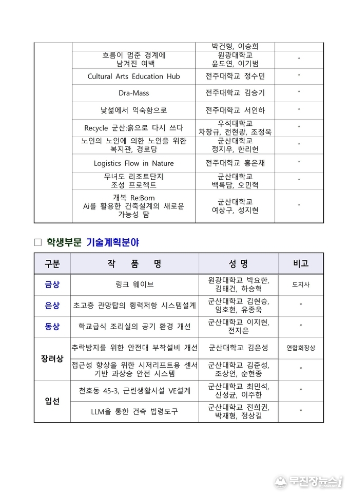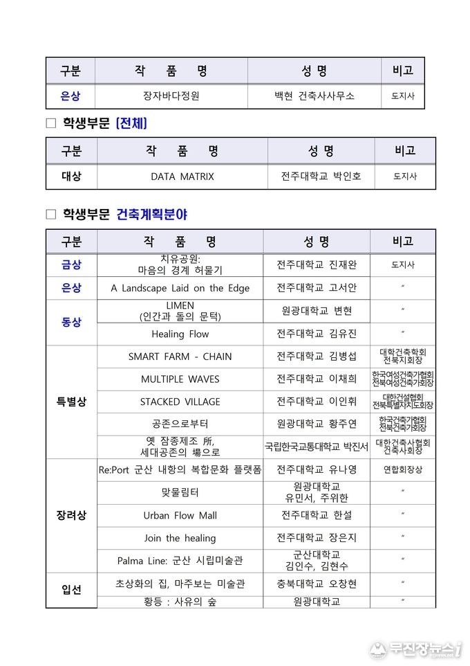 전북특별자치도는 2025년 ‘전북특별자치도 건축문화상’에서 공공·일반·학생 부문 총 46개 작품이 수상작으로 선정됐다고 5일 밝혔다.