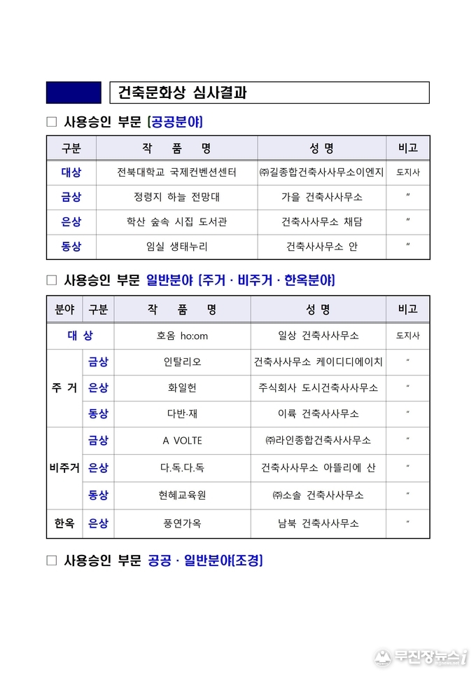 김형우 전북특별자치도 건설교통국장은 “이번 수상작들은 전북의 건축 수준과 미적 감수성을 대내외에 알리는 소중한 결과물”이라며, “앞으로도 지역 건축의 경쟁력을 높이고, 공공건축의 품격을 한 단계 더 끌어올릴 수 있도록 지원을 아끼지 않겠다”고 밝혔다.