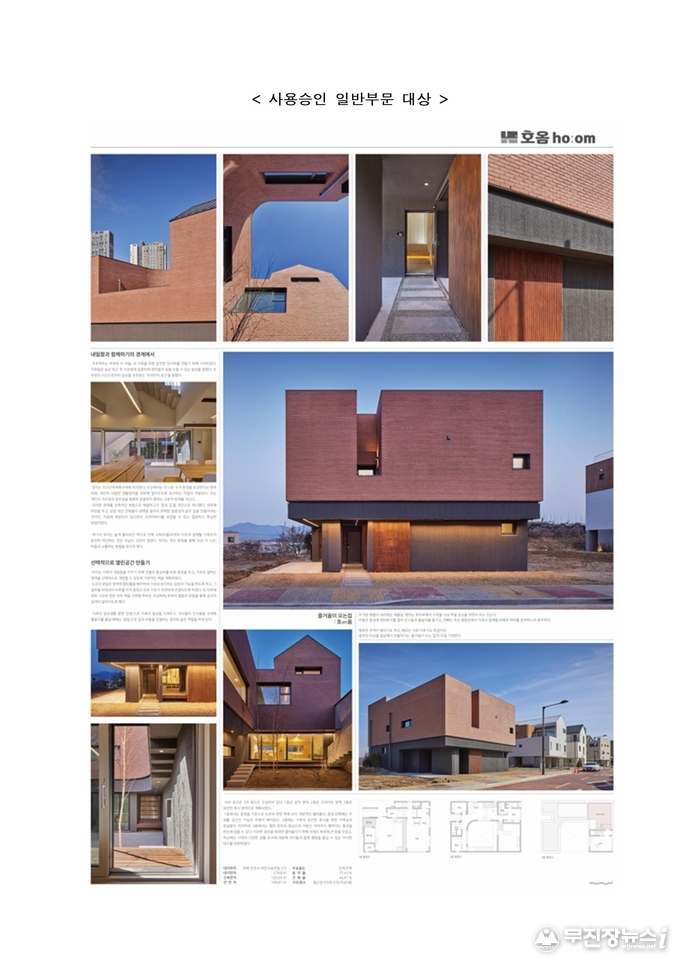 일반부문 대상에는‘호옴(ho:om)’이 선정됐다. 일상건축사사무소 채가을 건축사가 설계한 이 작품은 내·외부 공간의 경계를 유연하게 연결해 시선의 흐름을 자연스럽게 유도하고, 한옥의 마당 개념을 현대적으로 재해석한 점이 돋보였다. 지역적 특성과 현대적 감성을 조화롭게 담아내며 심사위원들의 극찬을 받았다.