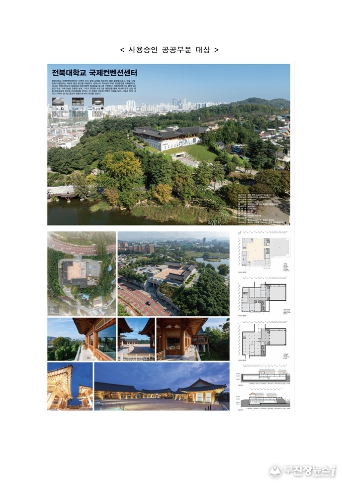 공공부문 대상은 전북대학교 국제컨벤션센터가 차지했다. ㈜길종합건축사사무소이엔지의 이길환 건축사가 설계한 이 건물은 학문과 문화가 교류하는 열린 플랫폼으로, 국제행사와 학술활동을 위한 복합 공간으로 평가받았다. 곡선형 지붕과 투명한 입면은 ‘열린 캠퍼스’의 상징성을 구현하고, 자연광 유입과 대공간 구성으로 쾌적한 환경을 조성했다는 점에서 높은 점수를 얻었다.