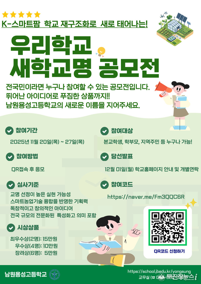 남원용성고등학교(송한득 교장)는 오는 20~27일까지 ‘우리학교 새학교명 공모전’을 추진한다고 19일 밝혔다.