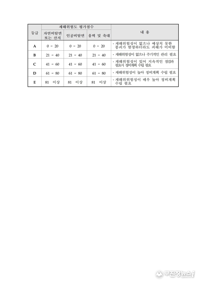 급경사지는 높이 50m 이상·경사 34도 이상의 자연비탈면이나 높이 5m 이상·길이 20m 이상·경사 34도 이상의 인공비탈면을 말한다. 재해위험도 평가 결과 D·E등급으로 분류된 곳은 붕괴위험지역으로 지정해 집중 관리하게 된다.