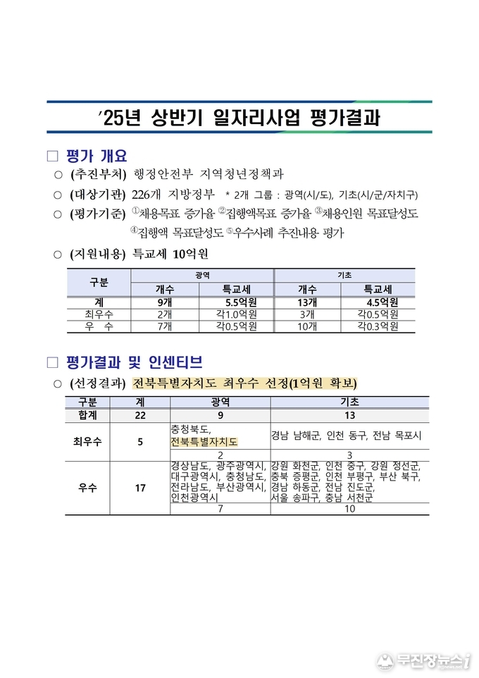 전북특별자치도는 행정안전부가 실시한 ‘2025년 상반기 일자리사업 평가’에서 전국 243개 지방정부 중 ‘최우수 지자체’로 선정됐다고 24일 밝혔다. 이번 평가 결과 전북도는 광역지자체 2곳에게만 주어지는 최우수 등급을 획득하며, 특별교부세 1억 원을 확보했다.