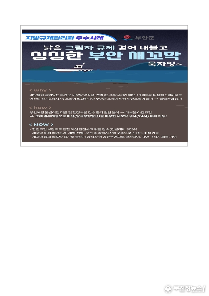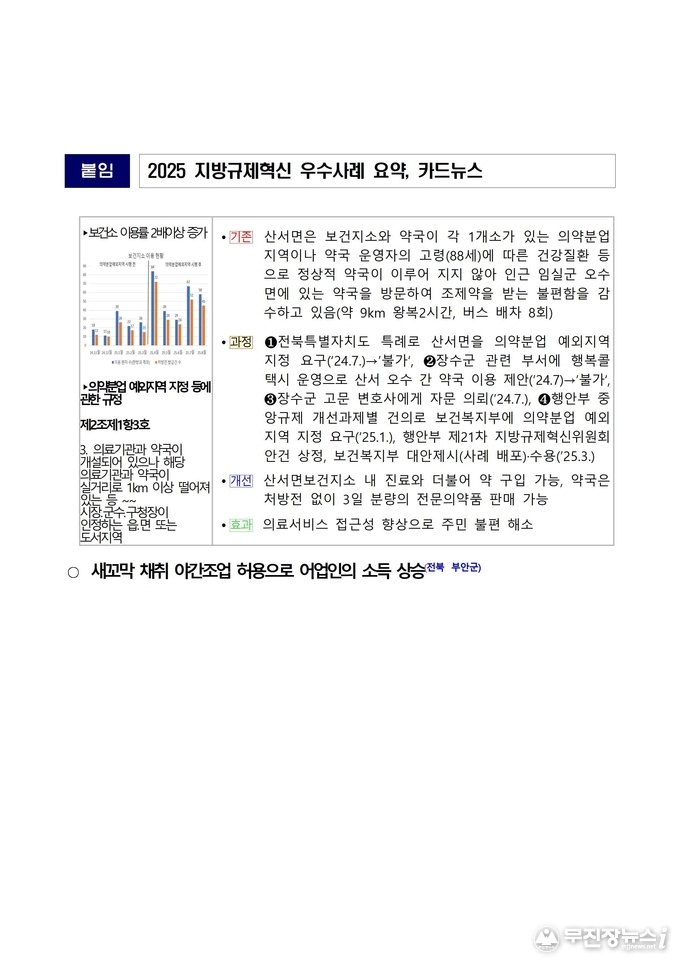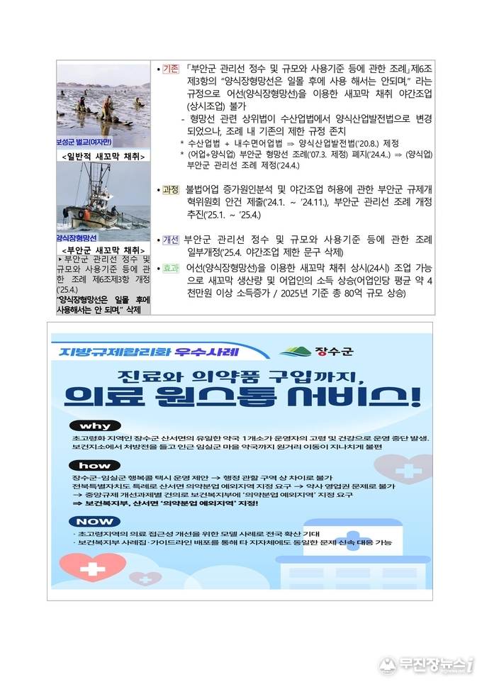 특히, 장수군의 ‘산서면 의약분업 예외지역 지정’ 사례는 지역 의료 접근성 향상과 주민 건강권 보장을 동시에 이뤄낸 점을 인정받아 장관상을 차지했다. 부안군의 ‘새꼬막 채취 야간조업 허용으로 어업인 소득 향상’ 사례는 자체 조례 개정으로 상시(24시간) 조업을 가능케 해 새꼬막 생산량 증대와 어업인 수입 증가에 기여한 점이 주목받아 장관상의 영예를 안았다.