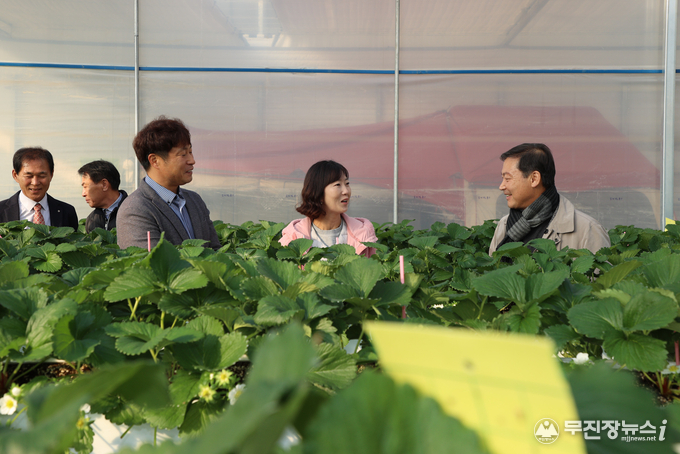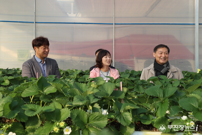 군은 먼저 부귀면 두남리 딸기 농가를 찾아 비닐하우스를 활용한 양액재배 시설을 살펴보고, 운영 상황을 확인했다.