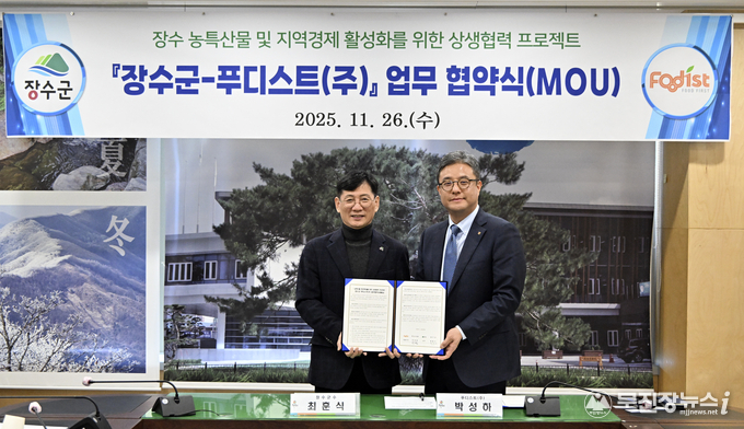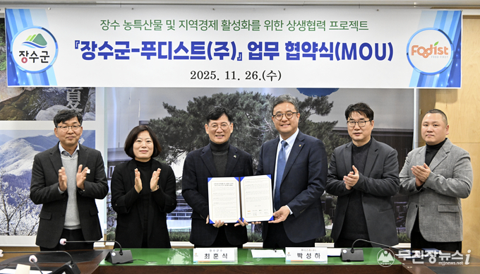 장수군은 26일 군청 회의실에서 B2B 식자재 전문 기업인 푸디스트 주식회사(사조그룹 계열)와 지역 경제 활성화와 농가 상생 발전을 위한 전략적 업무협약을 체결했다고 밝혔다.