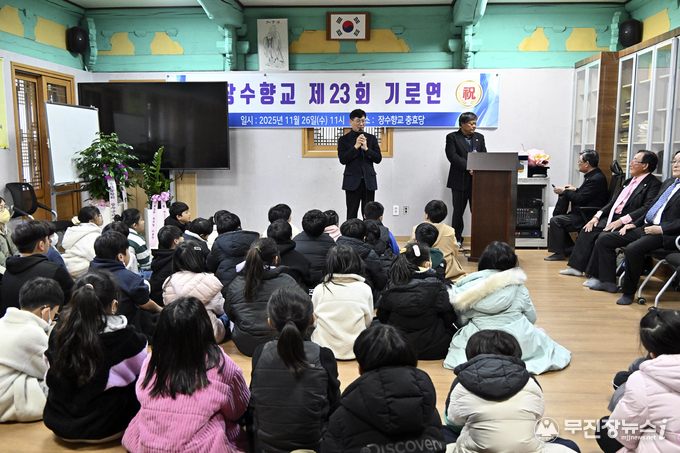 특히 올해는 개교 100년 이상 된 전통을 자랑하는 장수초등학교 3학년 학생 전원이 행사에 함께해, 웃어른께 큰절을 올리며 어른을 공경하는 예절을 직접 배우는 뜻깊은 시간이 됐다.