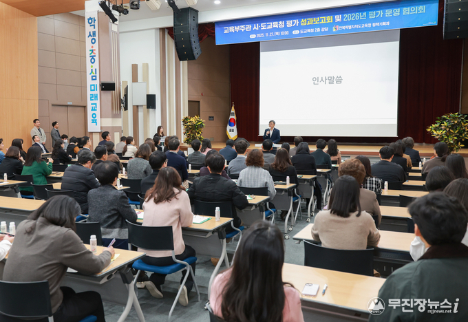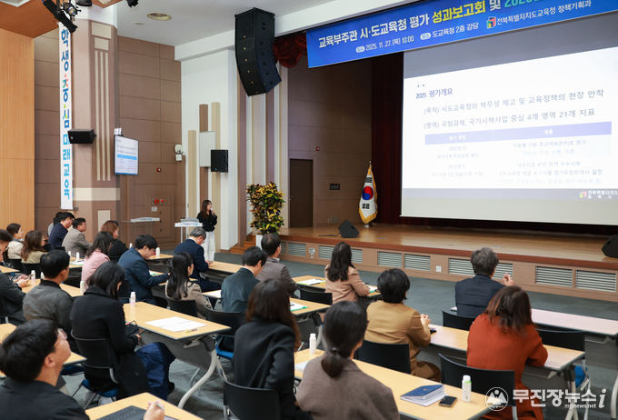 전북특별자치도교육청은 27일 본청 2층 강당에서 ‘교육부 주관 시도교육청 평가 성과보고회 및 2026년 평가 운영 협의회’를 열어 올해 평가 결과와 지표별 성과를 공유하고, 2026년 평가 대비 대응 방안을 논의했다.