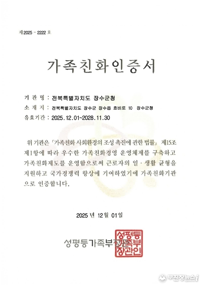 한편 장수군은 이번 재인증을 통해 2028년 11월까지 가족친화 기관 자격을 유지하게 되었으며, 앞으로도 건강한 근무환경 조성과 직원 복지 증진을 위한 다양한 조직문화 개선 정책을 추진할 계획이다.