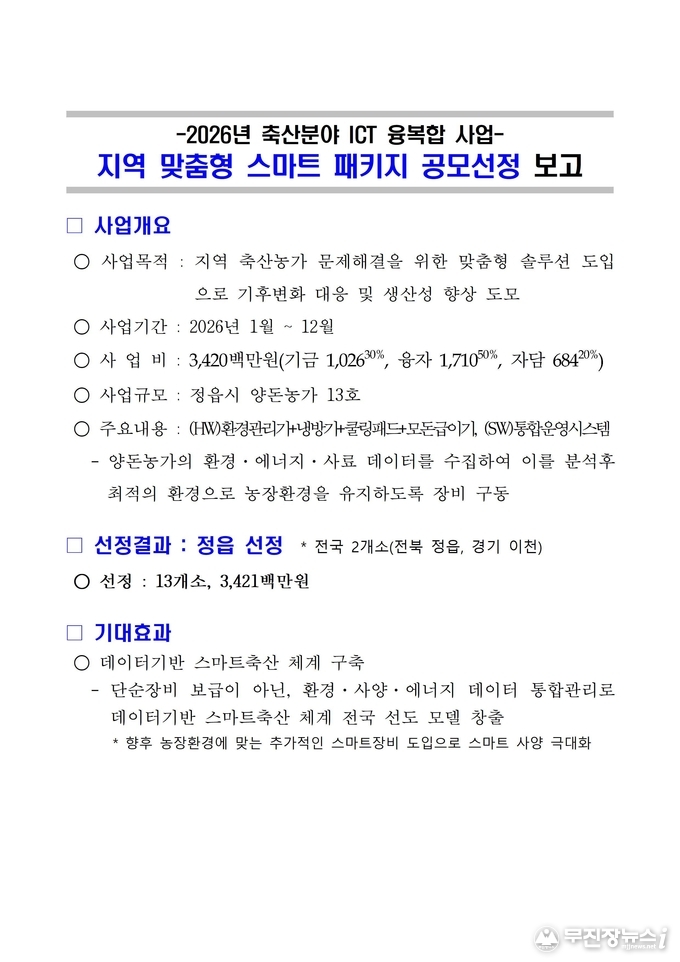 전북특별자치도는 농림축산식품부가 추진한 ‘2026년 지역 맞춤형 스마트축산 패키지 공모사업’에서 정읍시가 최종 선정됐다고 3일 밝혔다. 이번 선정으로 정읍 지역 양돈농가 13곳을 대상으로 총 34억 2,100만 원 규모의 스마트축산 패키지 구축사업이 내년부터 본격 추진된다.