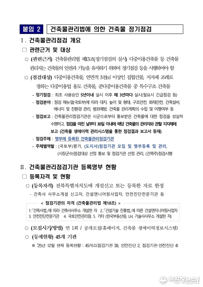 전북도는 건축물 관리 사각지대 해소를 위해 도내 68개 건축물관리점검기관을 전국 최초로 전수 점검해 부적합 기관 25곳의 자진 취소를 유도했다. 이와 함께 최근 5년간 정기점검 대상 1,000건을 전수 조사해 미보고 사례를 조속히 확인하고 후속 조치를 이끌어 2025년 4월 기준 정기점검 보고율을 62%까지 끌어올렸다.