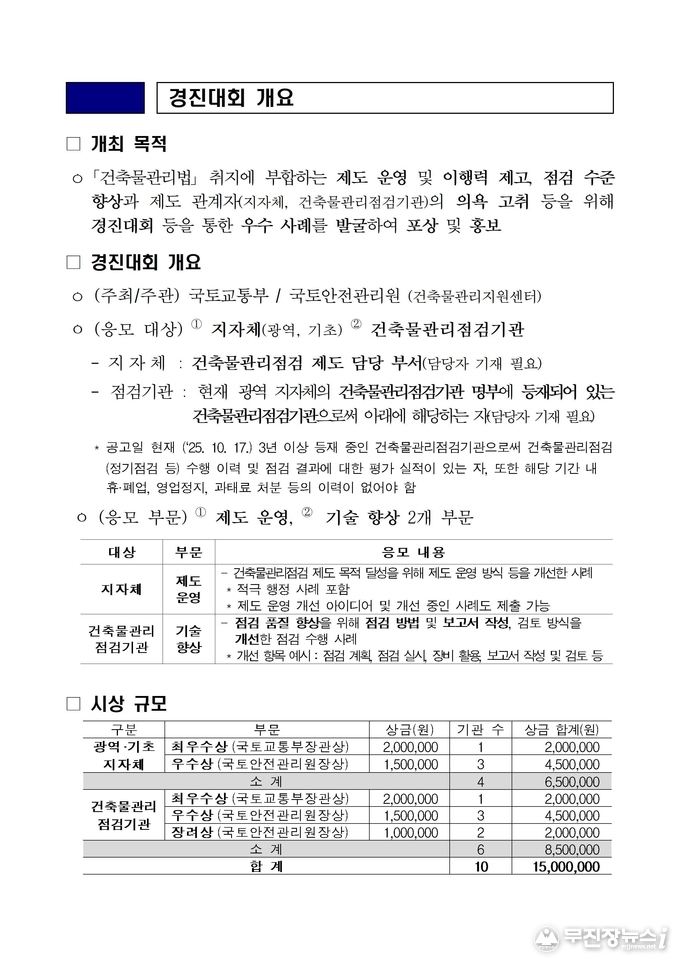이번 경진대회는 국토교통부와 국토안전관리원이 공동 개최했으며, 지자체와 건축물관리점검기관을 대상으로 제도 운영·기술 향상 등 두 개 부문에서 평가가 이뤄졌다. 전북자치도는 지자체 제도 운영 부문에 참여한 전국 광역·기초지자체 중 유일하게 최우수 기관으로 선정됐다.