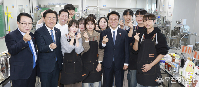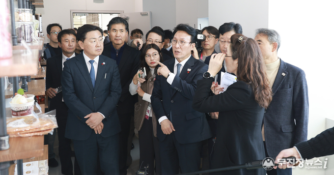 5일 익산 국가식품클러스터 청년식품창업센터를 방문한 김민석 국무총리가 김관영 전북특별자치도지사와 청년 식품기업 대표 및 참석자들과 K-푸드의 글로벌 경쟁력 확보를 위한 청년기업 지원 방안을 논의하고 창업센터를 둘러보고 있다.