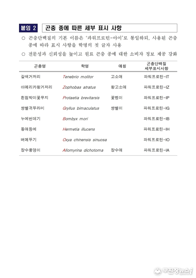 또한, 원료 곤충 종 정보를 소비자에게 폭넓게 제공하고 제품 신뢰성을 높이기 위해 기본 이름은 ‘파워프로틴-아이’로 하되, 원료 곤충 종에 따라 학명의 첫 글자를 아이 뒤에 붙여 사용*하기로 지침을 마련했다.