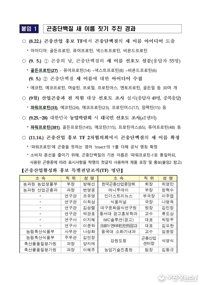 이어 곤충산업활성화 홍보 특별전담조직 2차 협의회를 갖고 전문가 조언을 얻어 ‘파워프로틴’에 아이(I)를 붙여 ‘파워프로틴-아이’를 공식 이름으로 최종 확정했다.