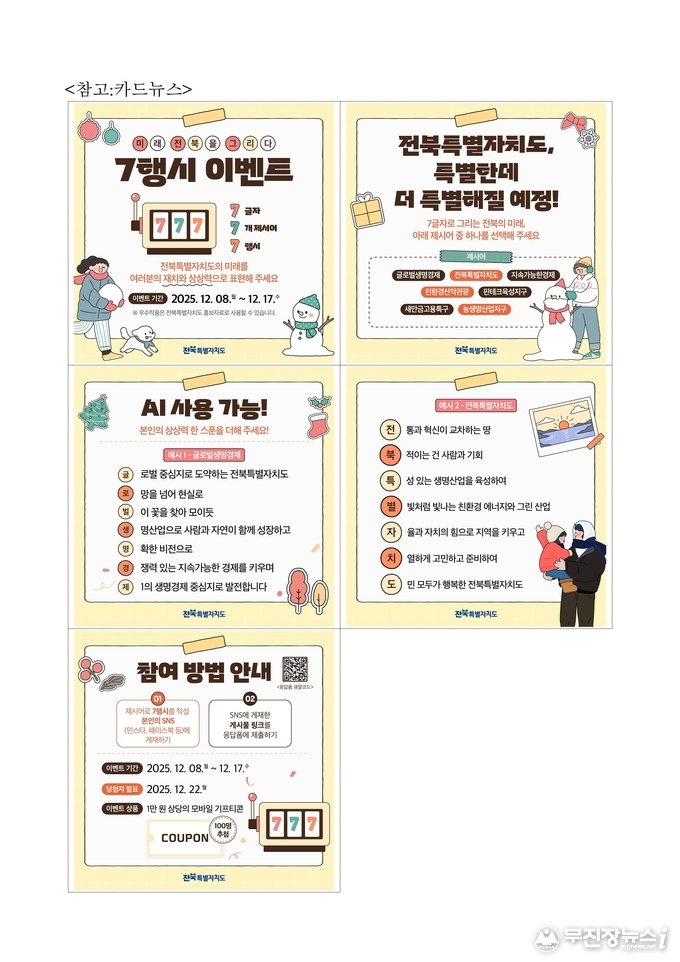 전북특별자치도가 도민이 직접 지역의 미래상을 표현해보는 ‘변화상 7행시 짓기’ 이벤트를 12월 8일부터 17일까지 열흘간 진행한다.