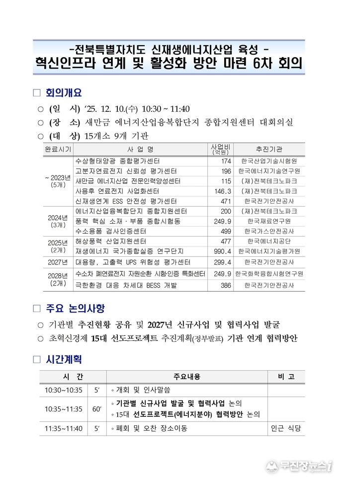 전북특별자치도는 10일 새만금 에너지산업융복합단지 종합지원센터 대회의실에서 ‘혁신인프라 연계 및 활성화 방안 마련 회의’를 개최하고, 도내 에너지 분야 혁신기관과 함께 협력사업 확대 및 중장기 신규사업 발굴 방안을 논의했다고 밝혔다.