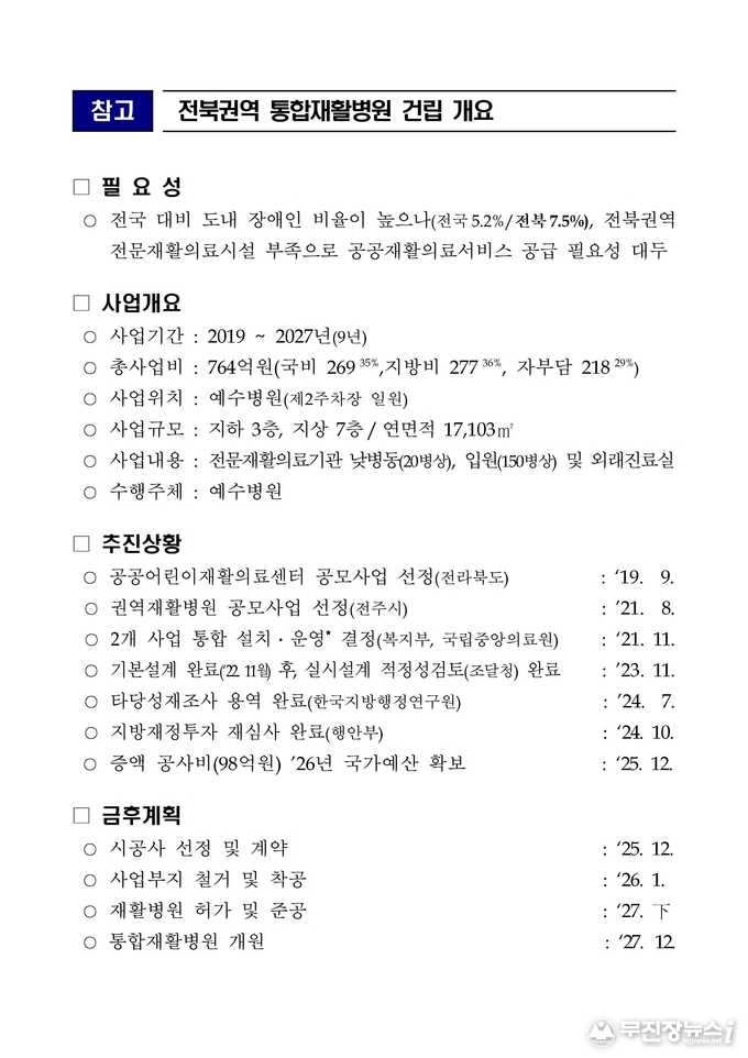 황철호 전북자치도 복지여성보건국장은 “전북의 재활의료 인프라 확충을 위한 핵심 사업의 추가 국비 확보에 따라 착공과 개원 일정이 안정적으로 진행될 수 있는 조건을 확보했다”라며 “도민들이 지역에서 끊김 없이 재활치료를 받을 수 있도록 사업을 차질 없이 추진해 나가겠다”고 말했다.