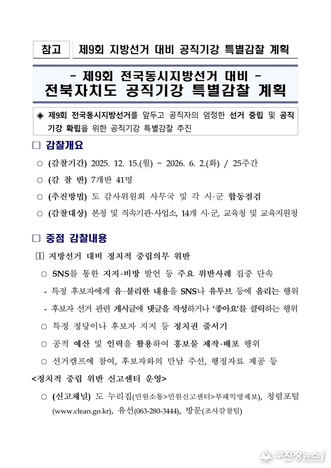 전북특별자치도 감사위원회가 내년 6월 치러지는 제9회 전국동시지방선거를 앞두고 고강도 암행감찰에 착수한다. 선거철 공직자의 정치적 중립 위반과 복무기강 해이를 사전에 차단하겠다는 강력한 의지다.