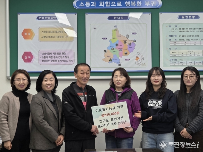 진안군 여자 줄다리기 선수단은 12일 부귀면 지역사회보장협의체(공동위원장 원현주·박영춘)에 이웃돕기 성금 34만원을 기탁했다.