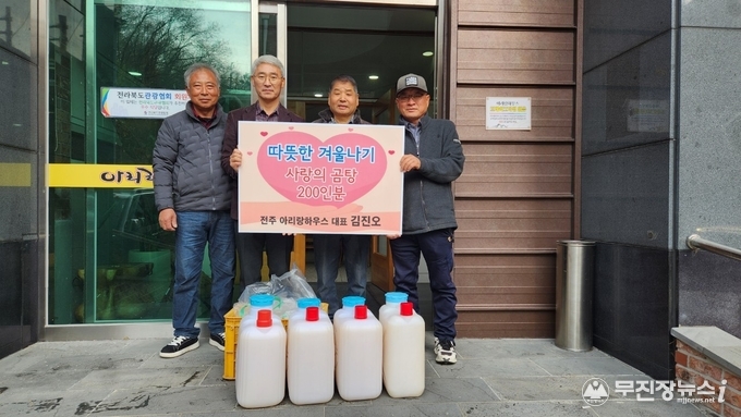 진안군 안천면은 전주시 인후동 소재 대중음식점인 아리랑하우스(대표 김진오)에서 관내 지역 주민들의 따뜻한 겨울나기 지원을 위해 사용하길 바란다며 면 지역사회보장협의체에 곰탕 200인분을 기탁했다고 밝혔다.