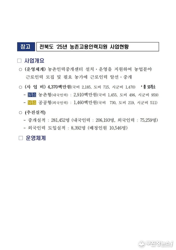 김종훈 전북특별자치도 경제부지사는 “이번 수상은 전북도의 농촌 인력지원 정책이 현장에서 실질적인 성과를 내고 있음을 보여주는 결과” 라며, “우수 사례를 도내 전 센터와 공유해 내년 농번기에도 농가가 체감하는 인력 지원 체계를 더욱 강화해 나가겠다”고 밝혔다.