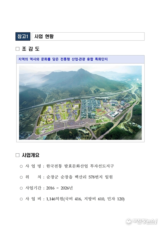 ‘한국전통 발효문화산업 투자선도지구’는 2015년 국토교통부 투자선도지구 공모사업에 선정되며 국비 100억 원을 지원받아 추진된 사업이다. 진입도로 건설과 단지 조성을 시작으로, 전통 발효문화를 기반으로 한 산업·관광 융합형 특화단지 조성을 목표로 단계적으로 추진돼 왔다.