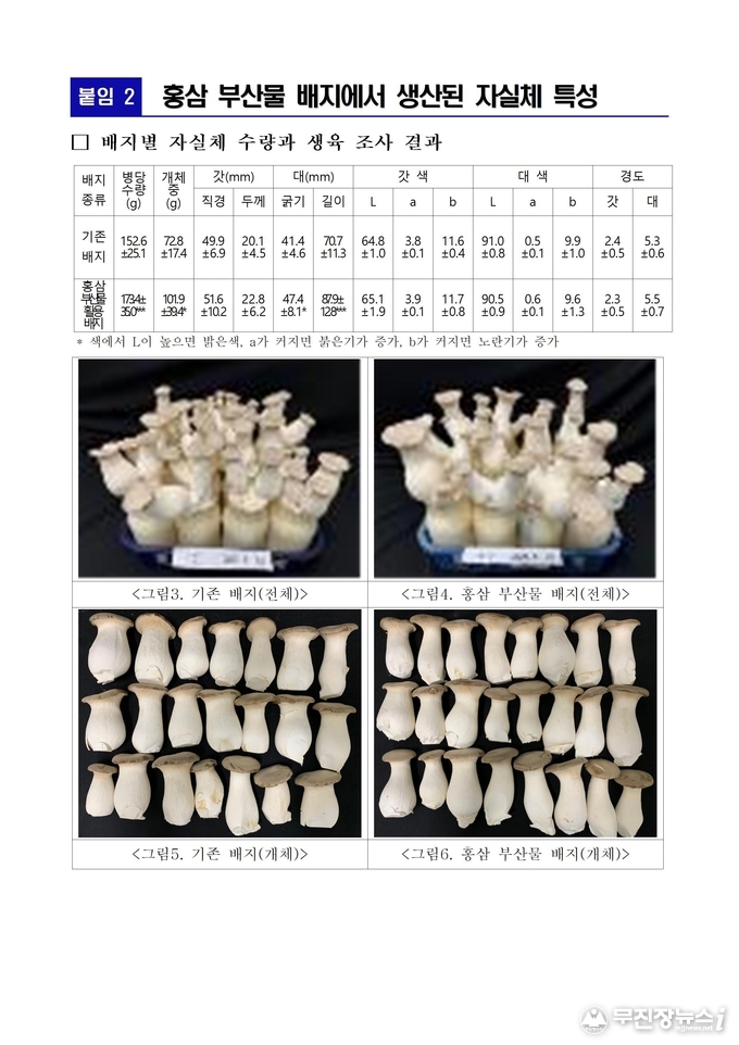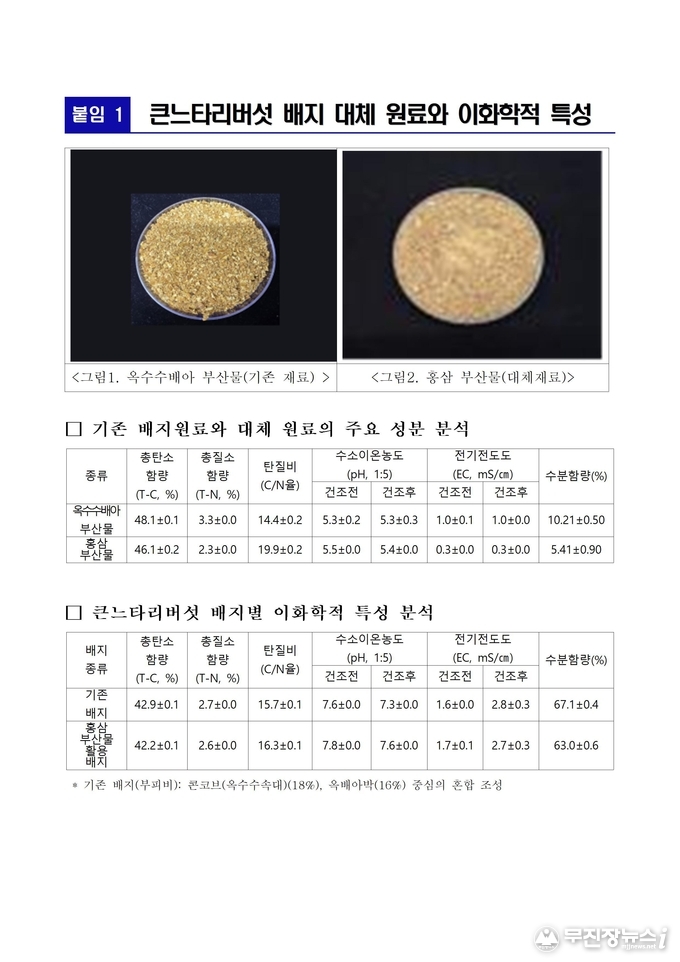 연구진은 기존의 옥수수배아 부산물 함유 배지와 홍삼 부산물 함유 배지를 재배용 병(1,100mL)에 동일 조건으로 넣은 뒤, 수확량·품질·경제성을 비교, 분석했다.