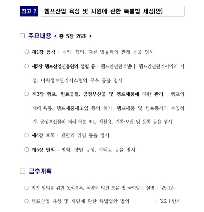 제도적 기반 마련도 본격화 되고 있다. 「헴프산업 육성 및 지원에 관한 특별법」은 헴프산업진흥원 설립, 안전관리지역 지정, 이력정보관리시스템 구축, 재배·제조업 허가 등의 내용을 담고 있다. 도는 지난해 7월부터 헴프산업 TF를 가동해 17회 전문가 자문을 진행했으며, 경북도와 공동으로 내년 상반기 국회 정책토론회를 열고 법안 발의에 나설 예정이다.
