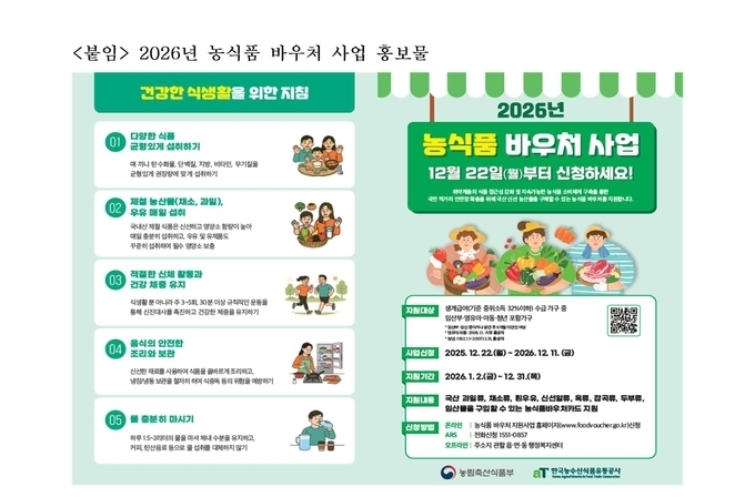또한 바우처 지원 기간도 기존 10개월에서 12개월로 확대돼, 대상 가구는 연중 안정적으로 신선한 국산 농축산물을 구매할 수 있게 된다.