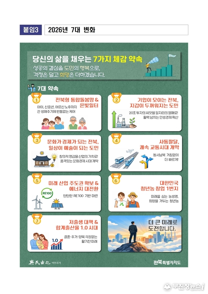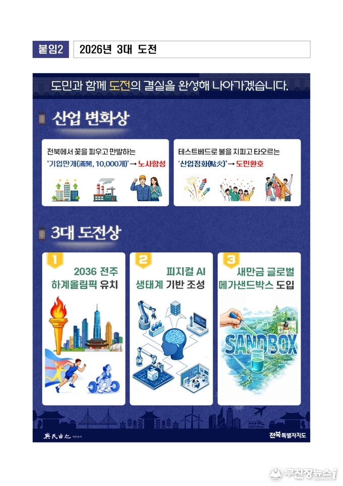 2026년 김관영 도정의 중점과제는 그간의 결실을 확장하고 한계를 넘어 전북 도약의 기반이 될 3대 도전과 7대 변화로 구성돼 있다.