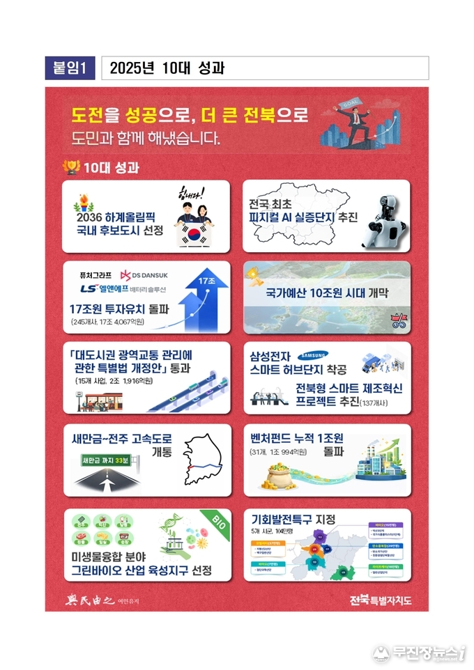 전북자치도는 지난 3여 년간 이어온 끊임없는 도전과 이뤄 왔던 성과 위에서 한계를 뛰어넘고 기대를 충족하는 성취를 이뤄내, 그 결실이 도민의 삶 전반에 온전히 공유되도록 하겠다고 밝혔다.