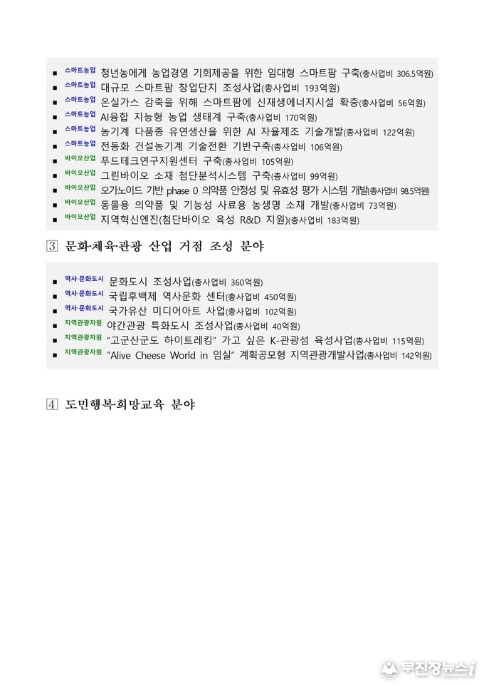 농생명산업수도 조성을 위해서도 청년농 임대형 스마트팜(306억 원), 대규모 스마트팜 창업단지(193억 원, 남원) 등 농업 혁신 기반을 강화했고, 동물용 의약품 및 기능성 사료용 농생명 소재 개발(73억 원, 정읍), 푸드테크 연구지원센터(105억 원, 익산), 지역혁신엔진(183억 원) 등 바이오 산업에서도 도약의 발판을 마련했다.
