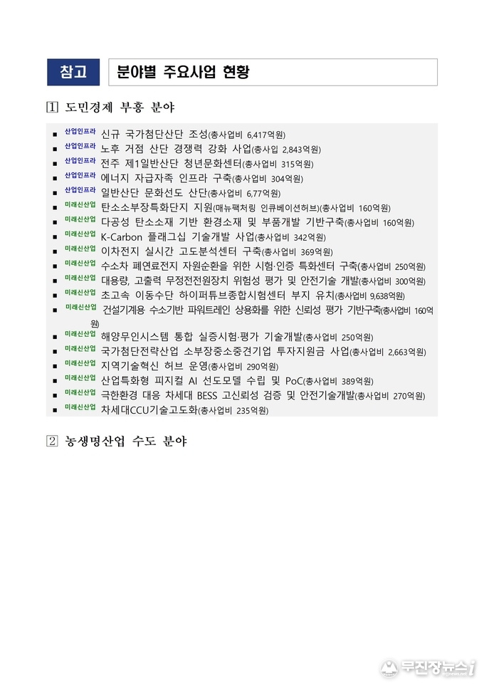천영평 전북특별자치도 기획조정실장은 “국가공모사업을 통한 예산 확보는 단순한 숫자가 아니라, 전북의 산업 생태계를 바꾸고 도민 삶의 질을 높이는 실질적 토대”라며 “도민과 함께 일군 성과를 바탕으로 전북이 대한민국 미래산업의 중심지로 도약할 수 있도록 도정의 전 역량을 집중하겠다”라고 말했다.