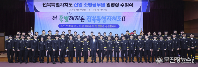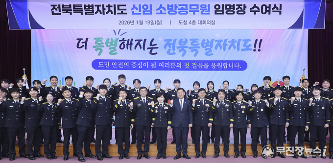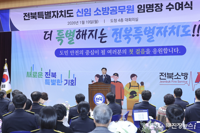 전북특별자치도는 19일 도청 4층 대회의실에서 2026년 신임 소방공무원 임명장 수여식을 열고, 도민의 생명과 안전을 지킬 신임 소방공무원 45명을 공식 임명했다.