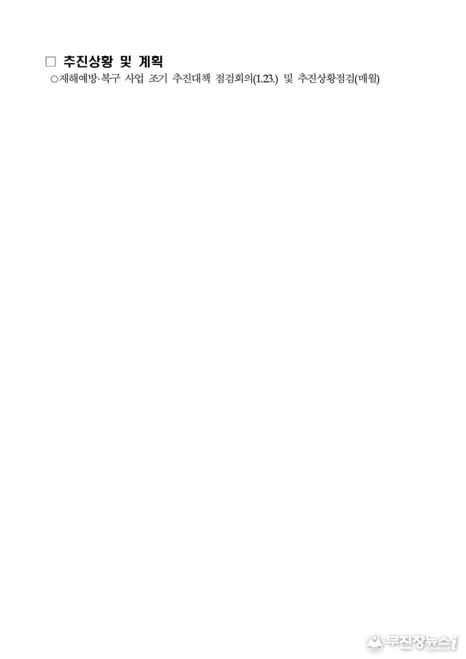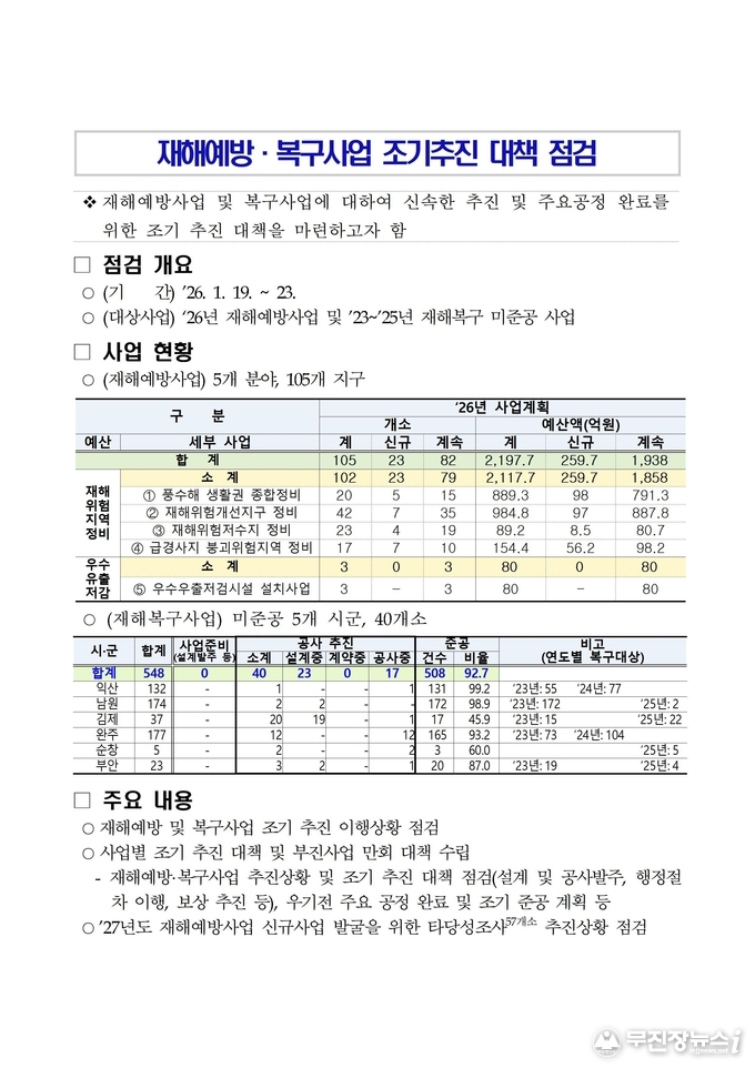 또한 2023년부터 2025년까지 추진된 재해복구사업 가운데 아직 준공되지 않은 사업에 대해서도 추진 상황을 점검하고, 부진 사업에 대한 만회 대책을 마련해 조기 준공을 유도할 계획이다.