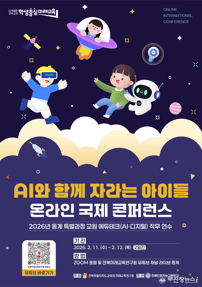 전북특별자치도교육청미래교육연구원(원장 김정기)은 오는 2월 11~12일 이틀간 『AI와 함께 자라는 아이들』 온라인 국제 콘퍼런스를 개최한다고 23일 밝혔다.