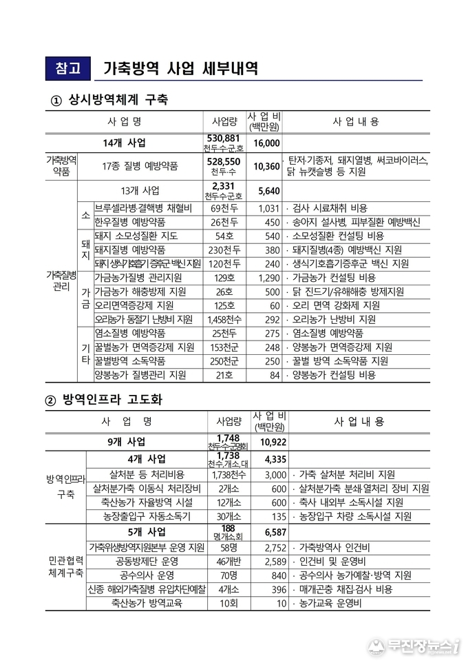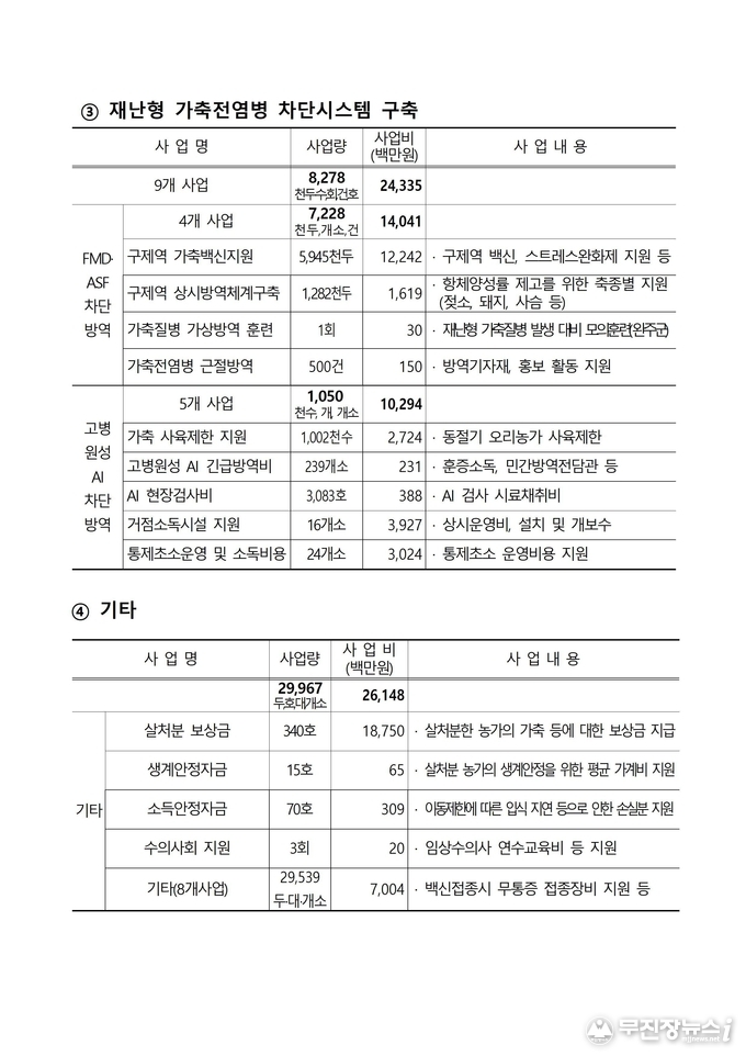 주요 사업으로는 △소·돼지·닭 등 가축방역약품 17종 공급(103억원) △구제역 예방백신 지원(122억원) △거점소독시설 및 통제초소 운영(63억원) 등이 추진된다.