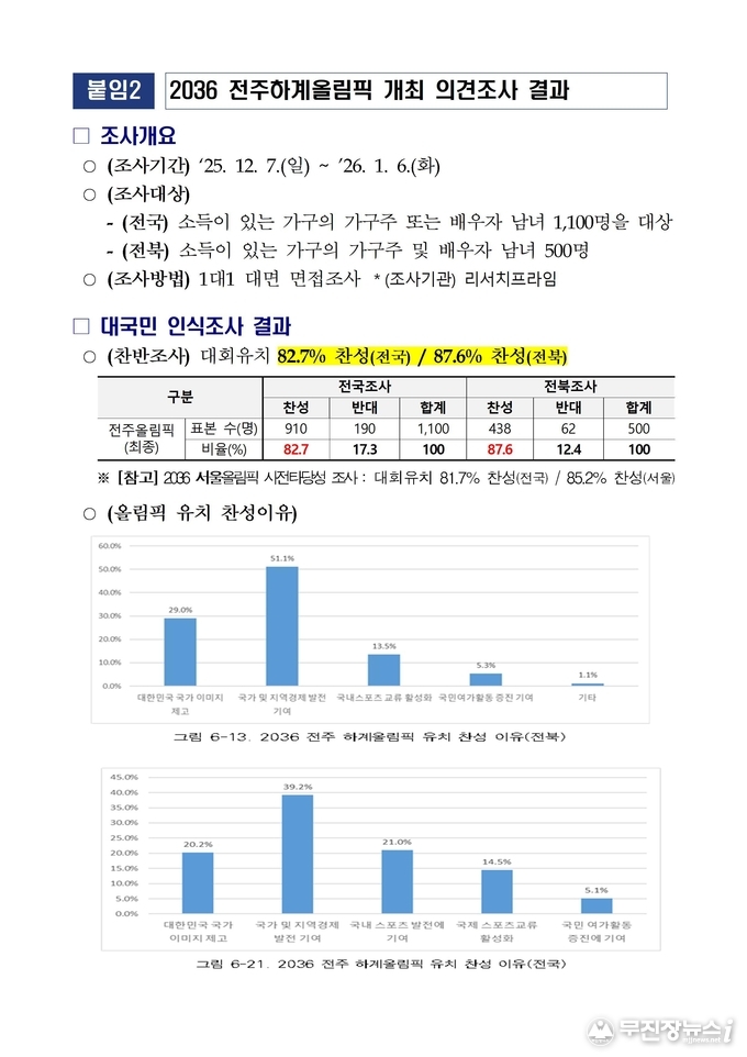 여론 지지도 탄탄하다. 한국스포츠과학원이 지난해 12월 7일부터 올해 1월 6일까지 약 4주간 실시한 국민 인식조사에서 전 국민 82.7%, 전북도민 87.6%가 전주 올림픽 유치에 찬성했다. 조사는 전국 가구의 세대주 또는 배우자 1,100명과 전북도민 500명을 대상으로 1대1 면접 방식으로 진행됐다. 주요 찬성 이유로는 ▲국가 및 지역경제 발전(전북 51.1%·전국 39.2%) ▲국가 이미지 제고(전북 29.0%·전국 20.2%) ▲국내 스포츠 교류 활성화(전북 13.5%·전국 14.5%) 등이 꼽혔다.