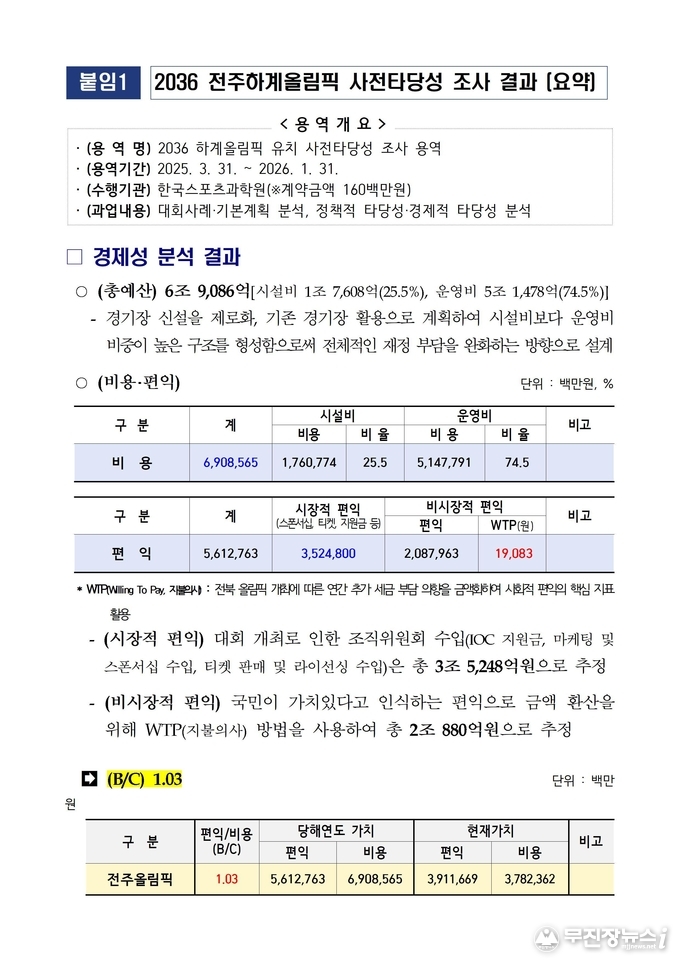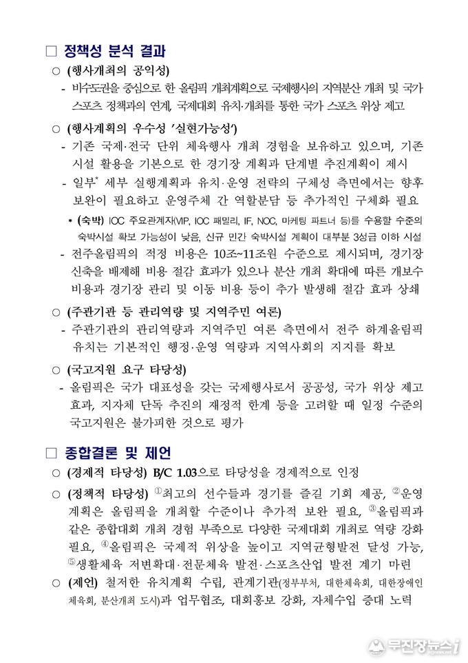 사전타당성 조사는 전주 올림픽이 가져올 다양한 효과도 제시했다. 세계 최고 수준의 선수들과 경기를 직접 즐길 기회를 국민에게 제공하고, 국제적 위상을 높이는 동시에 지역균형발전을 달성할 수 있다는 점이 강조됐다. 생활체육 저변 확대, 전문체육 발전, 스포츠산업 성장의 계기가 될 것으로도 전망됐다.