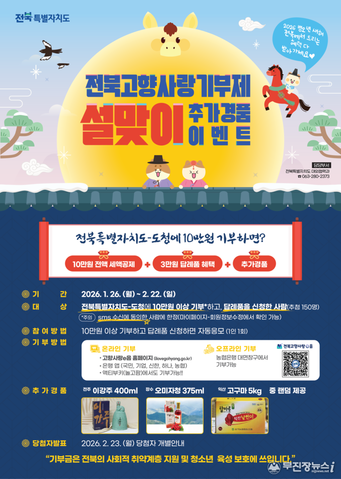 이번 이벤트는 고향사랑기부를 통해 지역 발전에 기여하면서도, 설 명절의 의미를 더할 수 있도록 마련됐다. 전북도는 기부금이 지역경제 활성화와 주민 복지 증진을 위한 다양한 사업에 활용될 수 있도록 투명하게 운영해 나갈 계획이다.