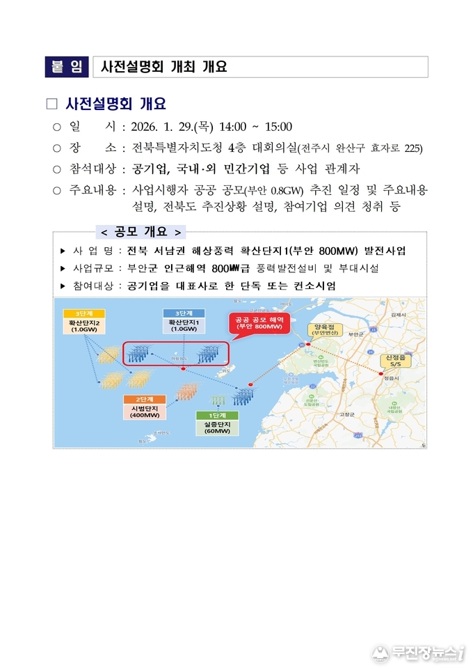 도는 부안 인근 해역 약 126㎢를 대상으로 하는 800MW급 해상풍력 발전사업의 시행자 모집을 위해, 오는 29일 도청 대회의실에서 사전 설명회를 개최한다고 27일 밝혔다. 이번 설명회는 유관 기관과 기업들을 대상으로 구체적인 공모 지침을 안내하고 현장의 의견을 수렴하기 위해 마련됐다.